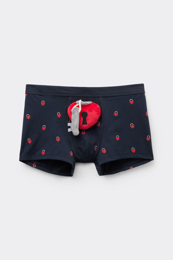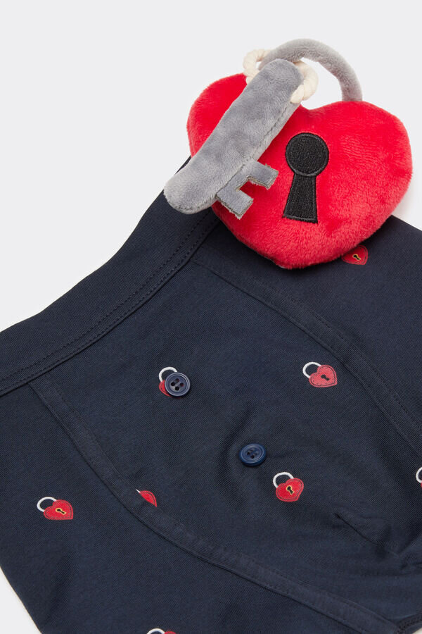 boxeri pentru bărbați din bumbac moale, elastic, de calitate superioară, cu imprimeu cu inimă și lacăt pe toată suprafața. o jucărie romantică din pluș în formă de inimă cu lacăt și cheie este atașată la buzunar.