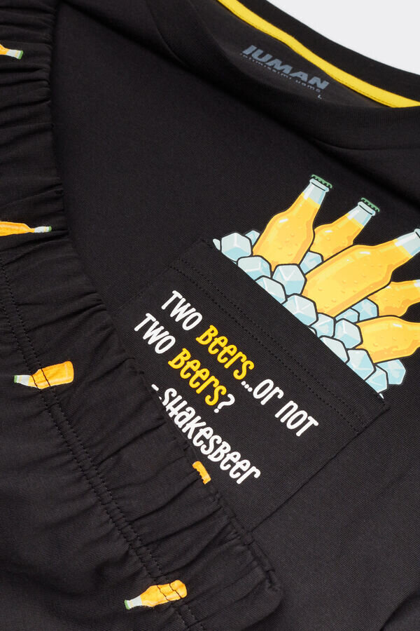 pijamale scurte din bumbac jersey. cămașa în culori uni are un buzunar decorat cu un text amuzant și câteva sticle de bere proeminente. pantalonii scurți au un imprimeu cu sticle de bere pe toată suprafața.