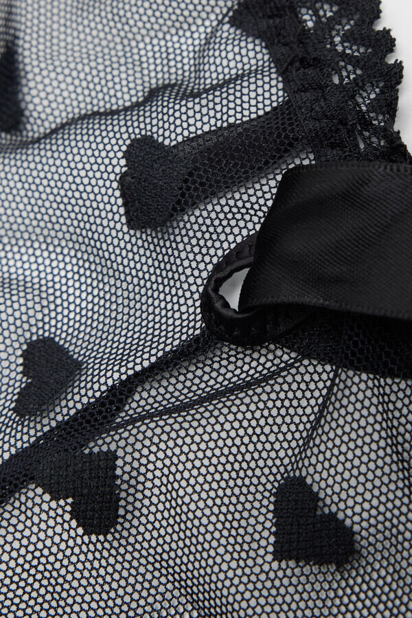 chiloți brazilieni hipster din tul cu imprimeu în formă de inimă, împodobiți cu broderii romantice în formă de inimă și volane. bretelele din satin sunt detașabile și pot fi folosite și ca un colier sau accesoriu de păr.