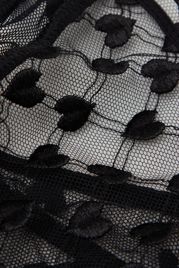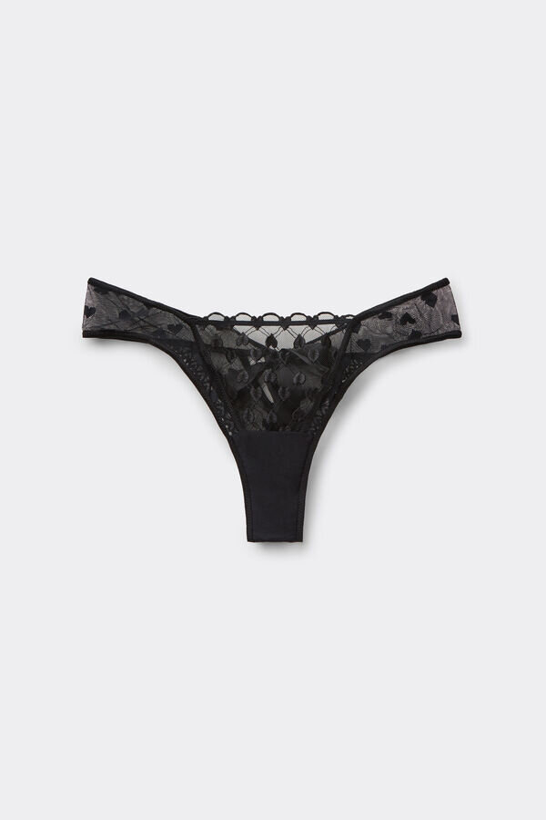 Brazilian-style pants from romantic lace adorned with hearts, featuring a heart-shaped ruffle and satin details on the back. The satin straps are detachable and can be used as a necklace or hair accessory.