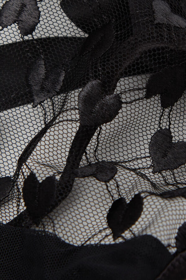 Thong din tul romantic brodat cu inimioare și bordură senzuală din satin. cureaua din satin este detașabilă și poate fi folosită și ca un colier sau accesoriu de păr.