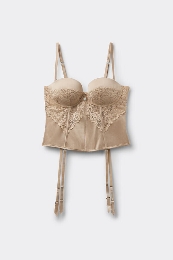 merrywidow rafinat și elegant din satin de mătase elastic, împodobit cu o dantelă brodată cu flori romantice. pandantiv în formă de inimă cu strasuri în centrul bustului. inserțiile din tul și nervuri creează un efect bustier, perfect pentru a fi purtat la vedere sau sub o jachetă.