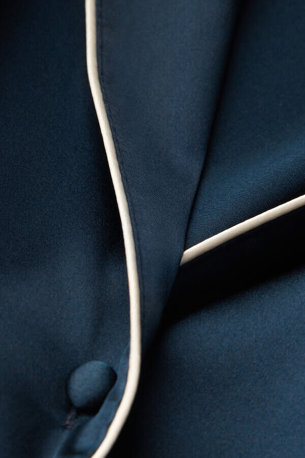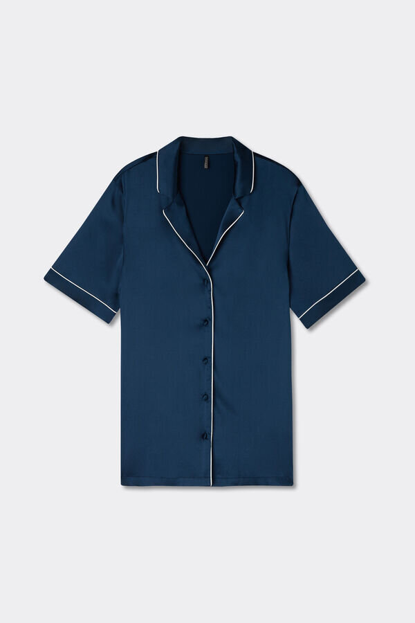 cămașă cu mâneci scurte din satin de mătase ușor elastic, cu croi masculin, cu borduri în ton sau în culori contrastante, în funcție de culoarea selectată. elegantă și confortabilă, este perfectă pentru a crea o ținută rafinată de seară, dar poate fi purtată și ca jachetă peste pantaloni sau blugi.