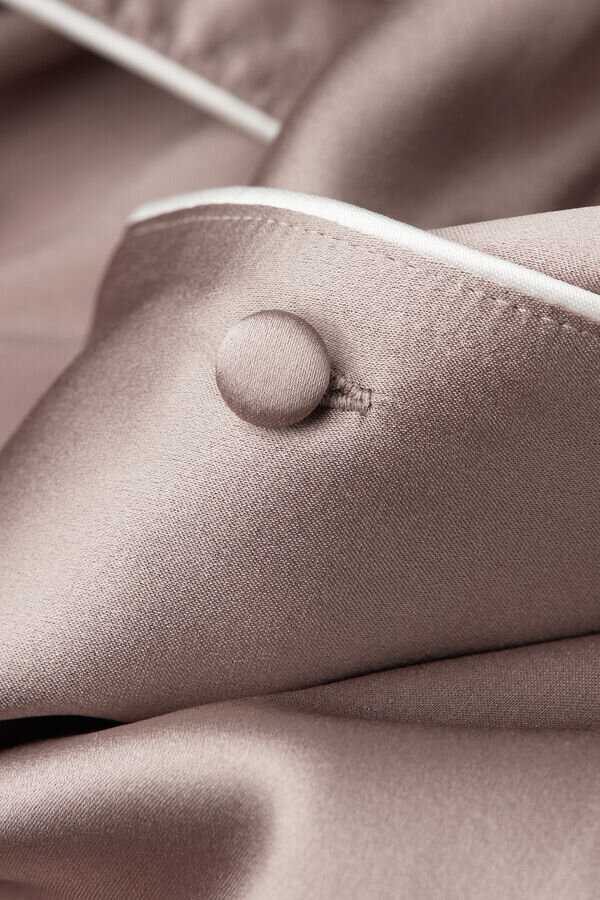 cămașă din satin de mătase ușor elastică, cu mâneci scurte, croială masculină, cu bordură în ton sau în culori contrastante, în funcție de culoarea selectată. elegantă și confortabilă, este perfectă pentru a crea o ținută rafinată de seară, dar poate fi purtată și ca jachetă peste pantaloni sau blugi.