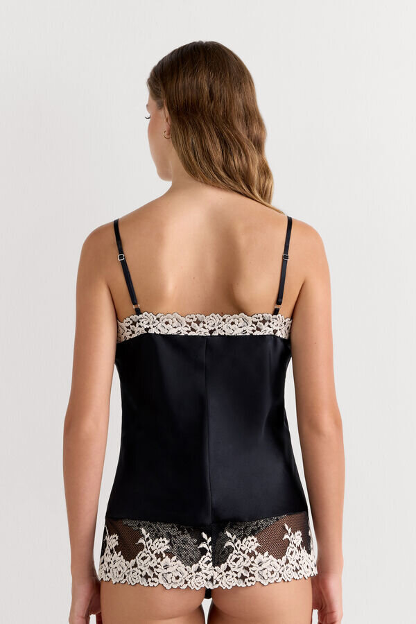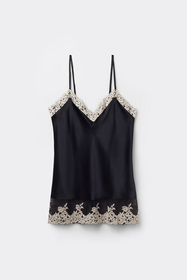 maieu din satin de mătase cu decolteu în V în față și în spate, împodobit cu inserții din dantelă la decolteu și la tiv. în funcție de culoarea aleasă, dantela poate fi de culoare contrastantă sau ton pe ton. bretele subțiri din mătase, complet reglabile. croială regular.