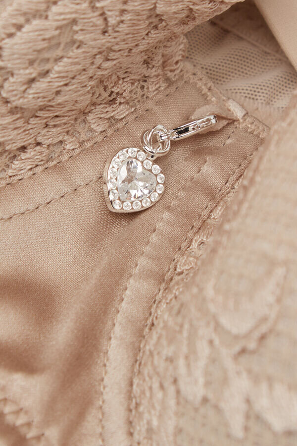 sutien balconette Sofia confecționat cu cupe din satin de mătase elastic și împodobit cu dantelă elastică rafinată, cu broderie florală și o bandă elastică elegantă din satin de mătase, cu un charm drăguț în formă de inimă, cu strasuri în centru. Este un sutien care se mulează natural, oferind un confort maxim, și este perfect pentru a fi purtat în mod provocator sub un decolteu sau un top transparent.