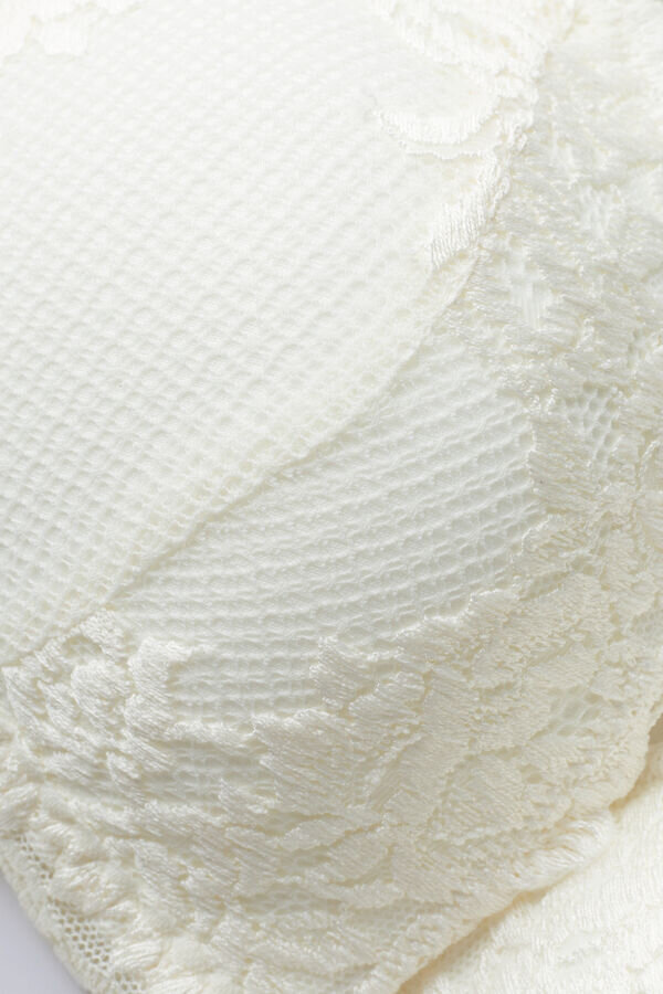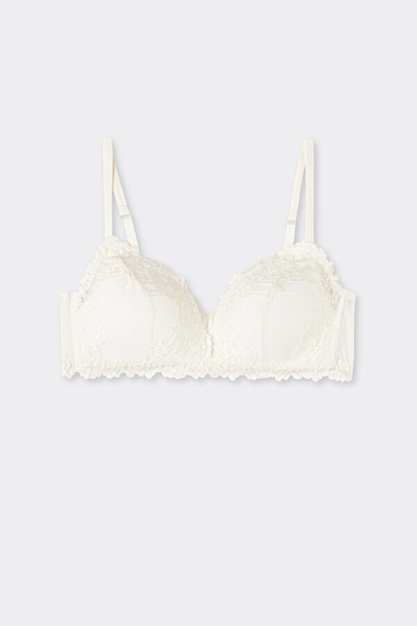 sutien triunghiular fără sârmă Tiziana, cu cupe ușor căptușite și balene laterale care susțin delicat bustul. este confecționat dintr-o dantelă elastică sofisticată și elegantă, cu broderie florală în tonuri asortate sau în culori contrastante, în funcție de versiunea prezentată. bretelele sunt căptușite cu microfibră și sunt reglabile în spate. Acest sutien modelează delicat bustul și oferă un suport ușor.