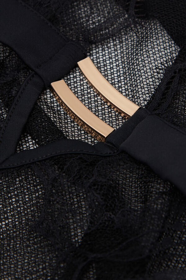 bodysuit cu corset din tul cu plasă, împodobit în partea de sus cu o dantelă chantilly florală elegantă și senzuală. Finisaj din microfibră și detaliu fin dintr-un accesoriu bijuterie de culoare roz auriu în centrul bustului.